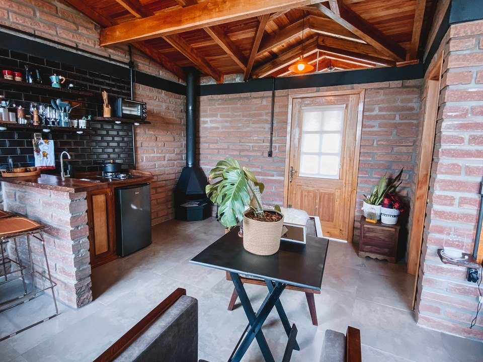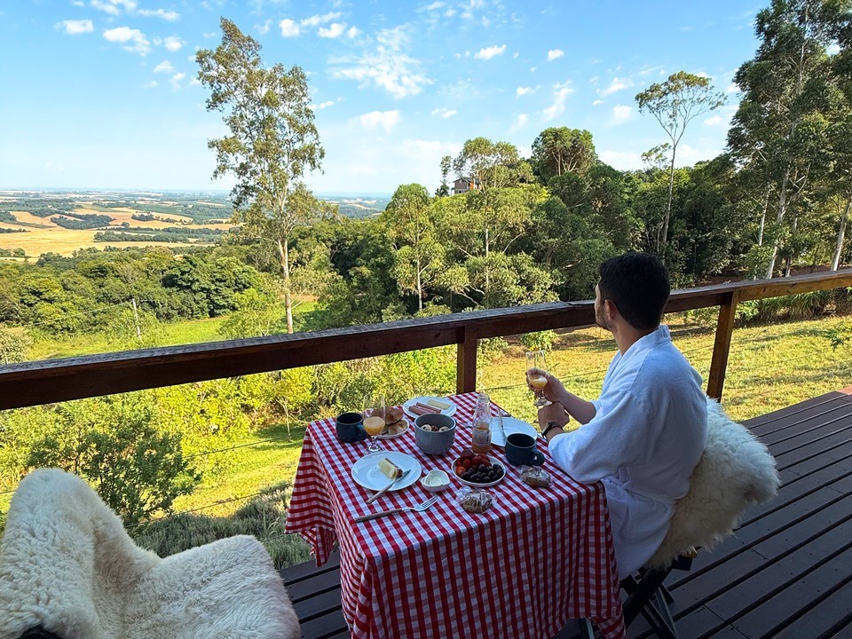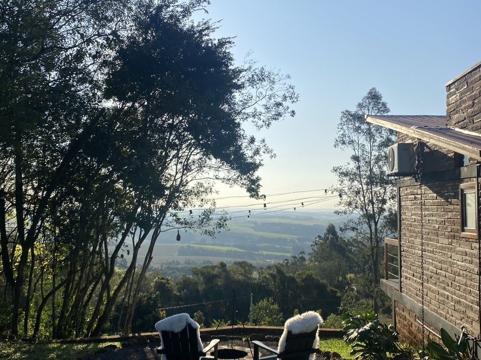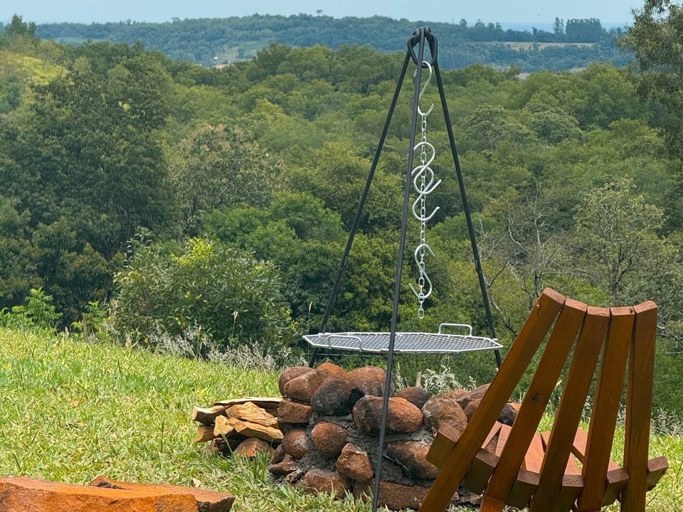 Dentro do chalé, você encontrará um ambiente integrado e aconchegante, cama box queen size com enxoval completo, ar-condicionado quente/frio, cortinas blackout e uma smart TV 32′ com Netflix e Prime Vídeo. Ao lado, uma mesa com poltronas cria o cenário ideal para refeições ou conversas relaxantes. A cozinha é prática e bem equipada para quem deseja preparar suas próprias refeições. Com cooktop, frigobar, forninho elétrico e armários completos com utensílios essenciais, garantindo que você tenha à disposição o necessário para aproveitar ao máximo sua estadia. O banheiro possui ducha com aquecimento à gás, toalhas e roupões, secador de cabelo e amenidades. O charme especial é a banheira dupla com hidromassagem para banhos relaxantes com uma vista espetacular do Noroeste Gaúcho. Além disso, possui lareira interna à lenha para momentos aconchegantes. Na área externa, um charmoso deck de madeira oferece uma vista deslumbrante para o horizonte, perfeito para contemplar o pôr do sol. O amplo gramado ao redor inclui um balanço. Além disso, há um espaço dedicado para fogo de chão com varal de luzes, para aproveitar as noites ao redor da fogueira.