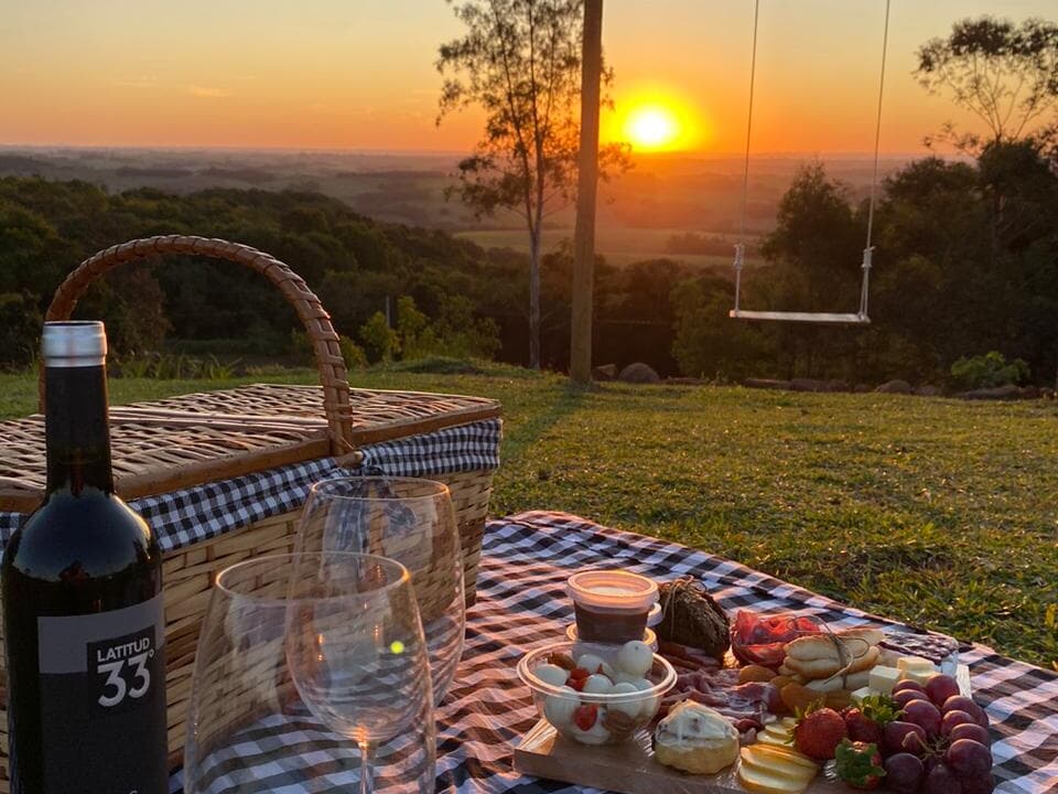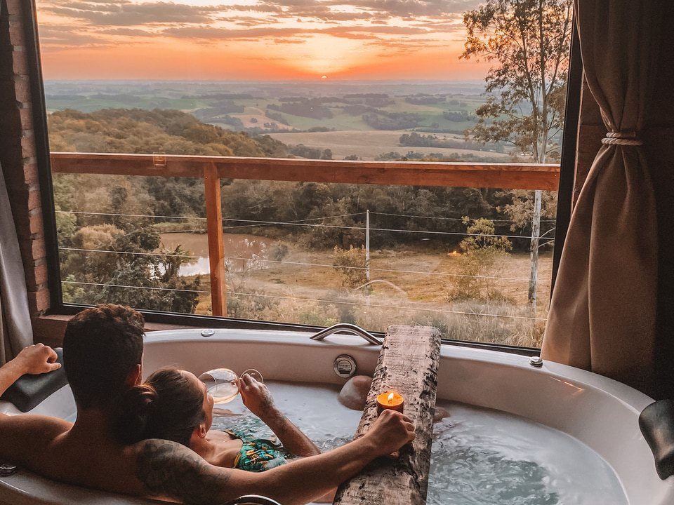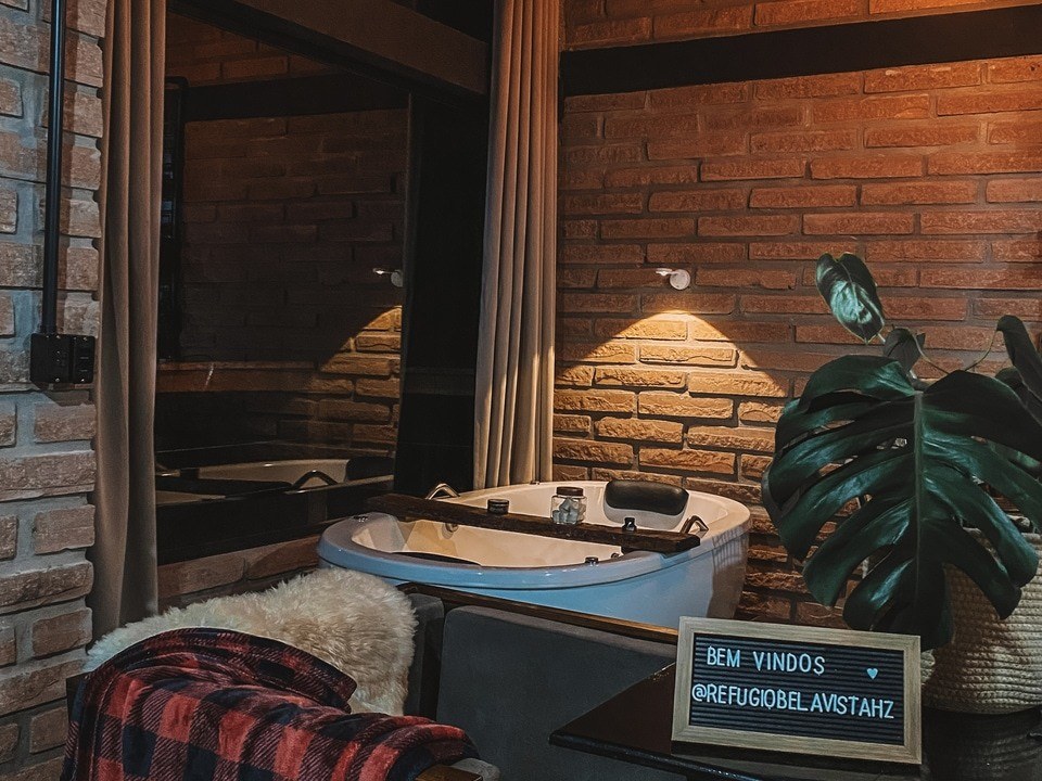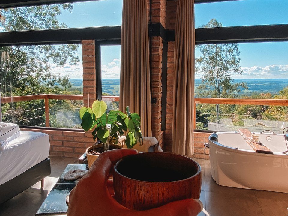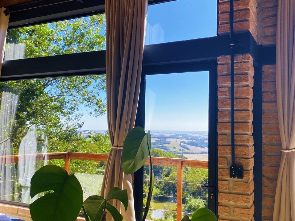 Dentro do chalé, você encontrará um ambiente integrado e aconchegante, cama box queen size com enxoval completo, ar-condicionado quente/frio, cortinas blackout e uma smart TV 32′ com Netflix e Prime Vídeo. Ao lado, uma mesa com poltronas cria o cenário ideal para refeições ou conversas relaxantes. A cozinha é prática e bem equipada para quem deseja preparar suas próprias refeições. Com cooktop, frigobar, forninho elétrico e armários completos com utensílios essenciais, garantindo que você tenha à disposição o necessário para aproveitar ao máximo sua estadia. O banheiro possui ducha com aquecimento à gás, toalhas e roupões, secador de cabelo e amenidades. O charme especial é a banheira dupla com hidromassagem para banhos relaxantes com uma vista espetacular do Noroeste Gaúcho. Além disso, possui lareira interna à lenha para momentos aconchegantes. Na área externa, um charmoso deck de madeira oferece uma vista deslumbrante para o horizonte, perfeito para contemplar o pôr do sol. O amplo gramado ao redor inclui um balanço. Além disso, há um espaço dedicado para fogo de chão com varal de luzes, para aproveitar as noites ao redor da fogueira.