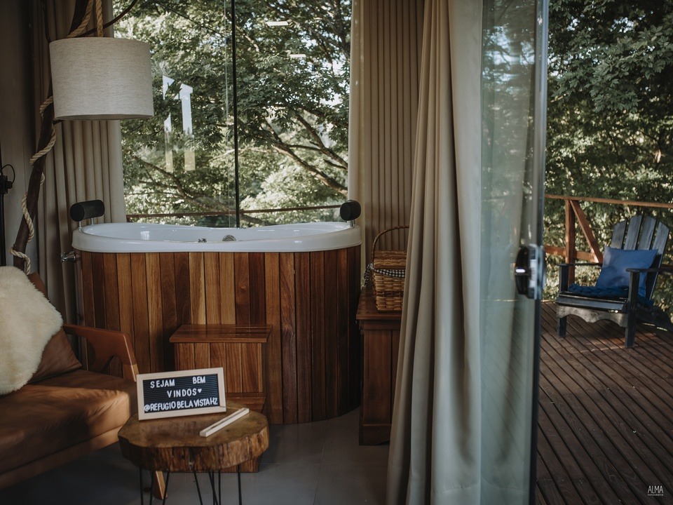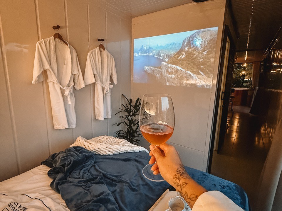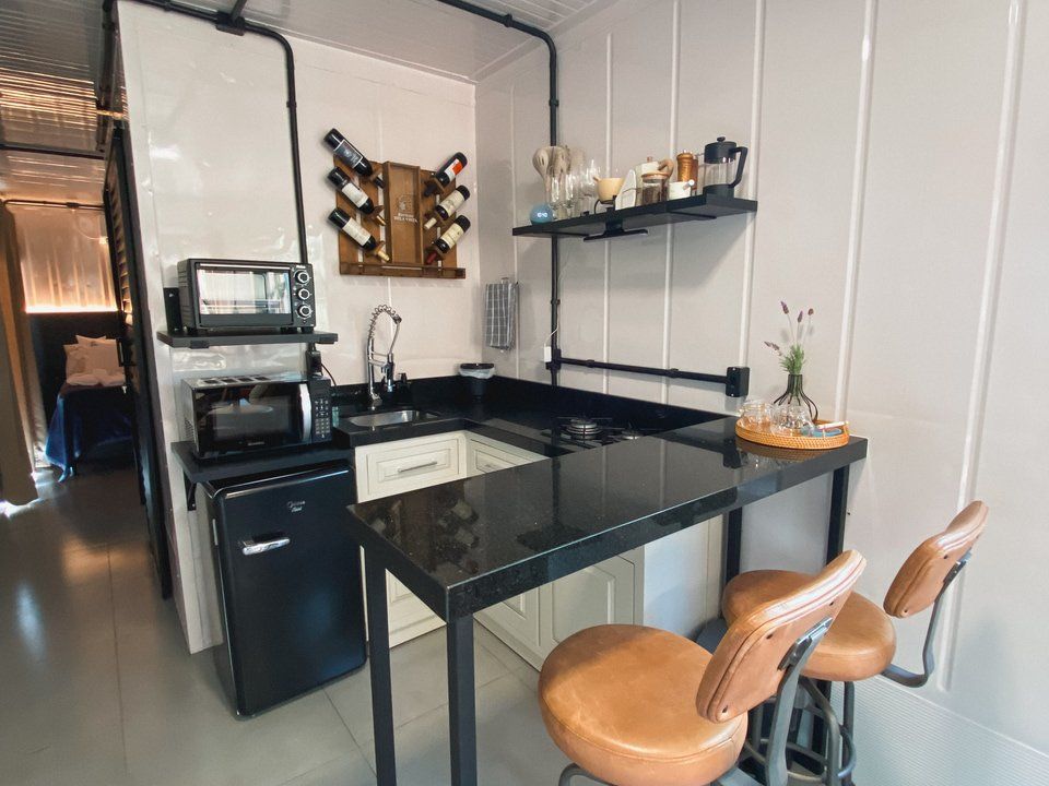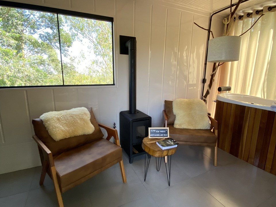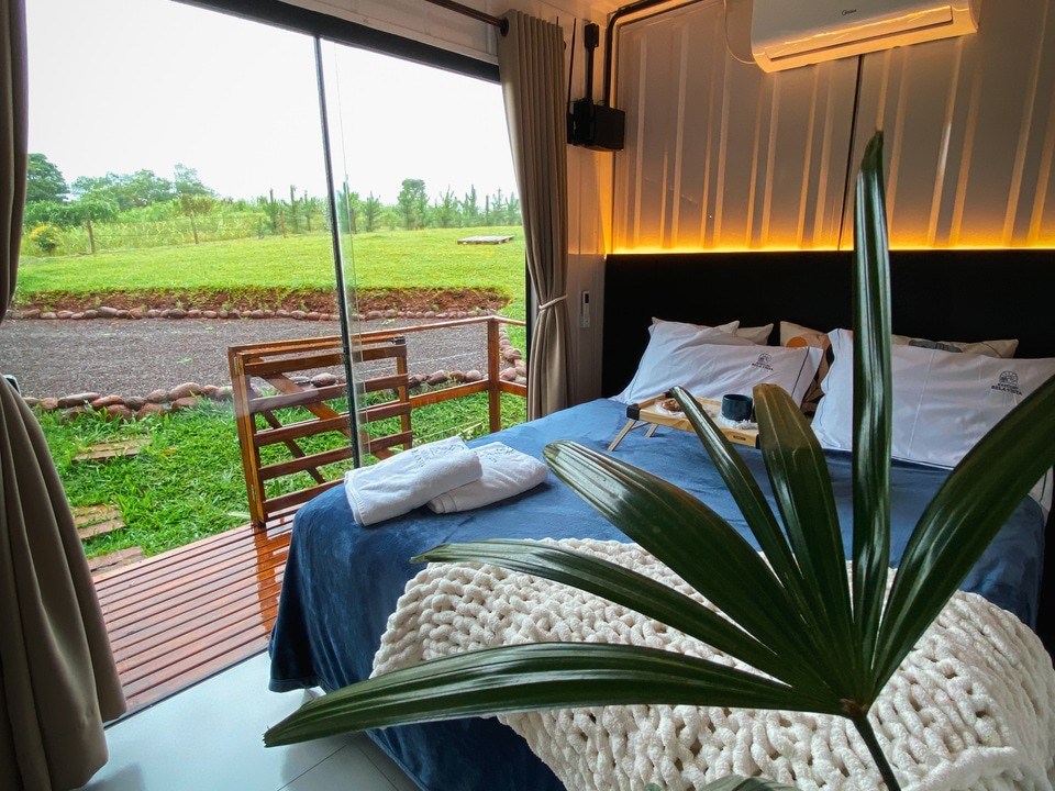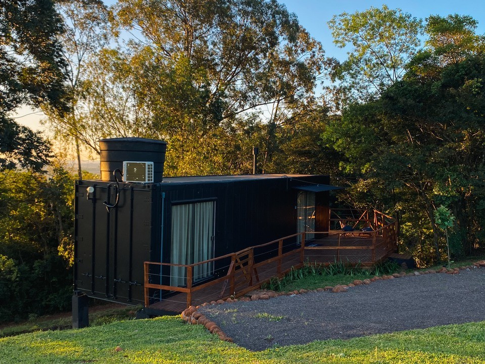 A Morada Container é um refúgio romântico e moderno, ideal para quem busca se reconectar com a natureza. Com um design inovador, combina o charme do campo com o conforto e a praticidade de uma hospedagem contemporânea, proporcionando momentos únicos em meio à tranquilidade e ao verde da região. O interior da Morada Container é compacto, mas cuidadosamente projetado para aproveitar cada espaço com funcionalidade e estilo. A cozinha é equipada com tudo que você precisa para preparar suas refeições: frigobar, forno elétrico, cooktop, micro-ondas e armários repletos de utensílios. Além disso, um quarto aconchegante, perfeito para descansar após um dia em meio à natureza. Cama box queen com enxoval de alta qualidade, ar-condicionado, cortinas blackout e Projetor. Para maior comodidade, um banheiro completo dispõe de ducha com aquecimento à gás, toalhas e roupões, secador de cabelo e amenidades. Um charme especial da Morada Container é um cantinho dispondo de um ofurô com hidromassagem oferecendo uma vista incrível para a natureza ao redor. Além disso, uma lareira aconchegante, com poltronas confortáveis ao lado e TV Smart 32′. Além disso, um amplo gramado proporciona o ambiente ideal para um piquenique ao ar livre. Também possuímos fogo de chão com trempe campeira e a vista do pôr do sol.